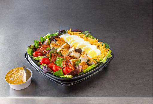 ................................US$13.07What's On It: Whatachick'n Filet (Cobb Salad), Hard Boiled Egg (1), Shredded Cheese (1), Bacon Slices (3), Grape Tomatoes (6), Grated Carrots, Red Roma Blend